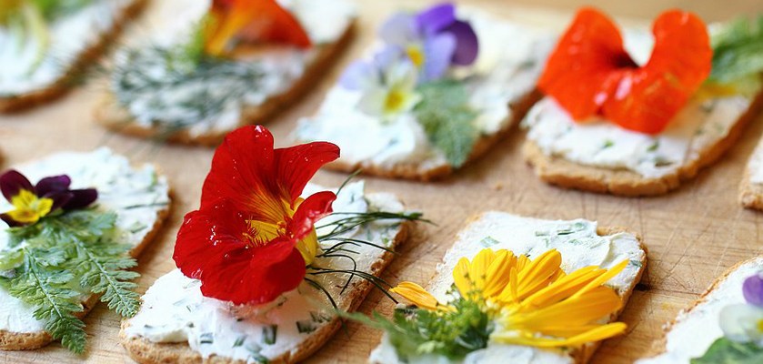 Los pétalos y flores aportan un excelente toque cromático a cualquier ensalada (por muy sencilla que sea), a una crema fría de verano o a un batido de frutas y yogur. Pétalos de caléndula, capuchinas amarillas o anaranjadas, pequeños pensamientos, las estrellas azules de la borraja, los pompones rosados del cebollino, entre tantas otras flores, son algunos ejemplos de la utilización en cocina de estos elementos . Pero ahí no acaba su contribución a la cocina, también se utilizan las flores para dar a los platos notas de sabor. Si son de corola pequeña se suelen añadir enteras, o se desechan estambres, pistilos y cálices, que pueden resultar ligeramente amargos y duros, y se usan solo los pétalos.
