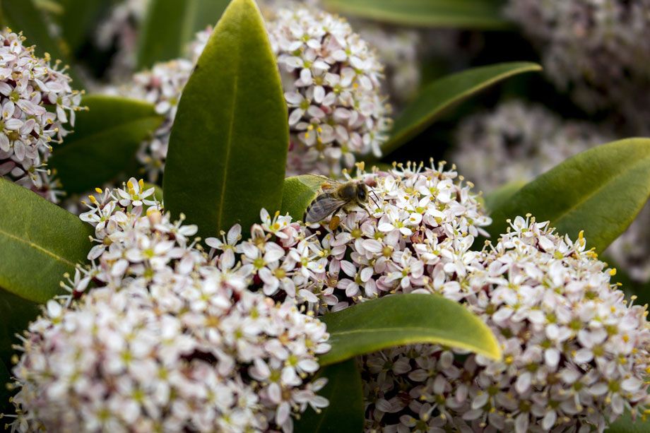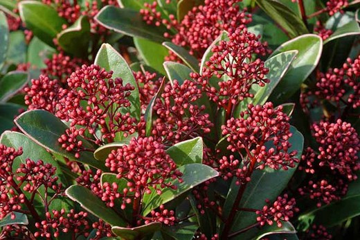 Entre el follaje coriáceo verde oscuro de las skimmias (Skimmia japonica) surgen en noviembre diminutos botones florales de color púpura, rojo, rosado o dorado. Parecen pequeñísimas bayas pero son simplemente flores que se abrirán en forma de diminutas estrellas blancas al llegar la primavera. La silueta redondeada y compacta de las matas convierte a las skimmias en plantas ideales para tiestos. Entre los cultivares más espectaculares que encontrarás figuran ‘Rubella’*, que emite multitud de densos ramilletes de botones rojos entre hojas que adquieren tonos rojizos en invierno, ‘Rubinetta’, ‘Rubesta’, ‘Red Dwarf’ y ‘Magic Marlot’, de follaje variegado. También encontrarás skimmias que producen llamativas bayas rojas (‘Pabella’) o blancas (‘Alba’), que persisten en las plantas todo el invierno.