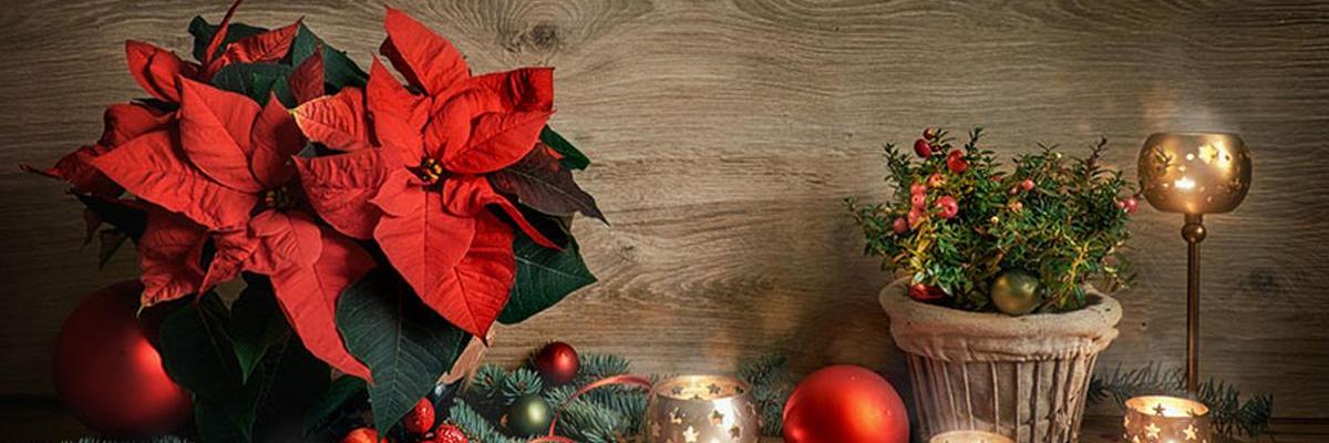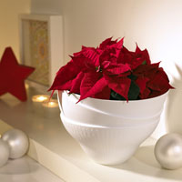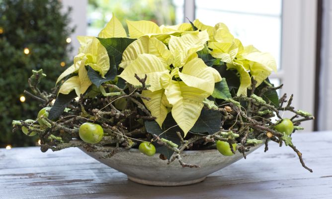 Unas poinsettias amarillas combinadas con manojos de palos de canela y ramitas de pino dentro de un macetero de acabado rústico o una cesta de mimbre su¡in asas puede convertirse en un centro de ideal para decorar la mesa de casa o el mostrador de un restaurante. Una poinsettia roja dentro de un recipiente blanco componen un detalle navideño que no necesita mucho más para resultar sumamente atractivo. O combinar el dorado de las Fiestas con el verde de las hojas y los tonos asalmonados de las nuevas variedades. Una decoración mucho más natural y a la última: ramitas gris plata de Calocephalus, ideales para realzar unas flores de Pascua amarillas dentro de un cubo o maceta oscuro que ofrezca contraste.